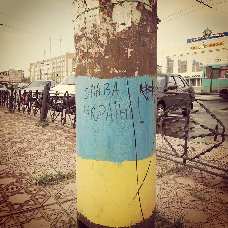 - Takimi flagami zdobione są wszystkie słupy wokół miast należących do strony Ukraińskiej. Pisakiem napisano: “Sława Ukrainie!”.